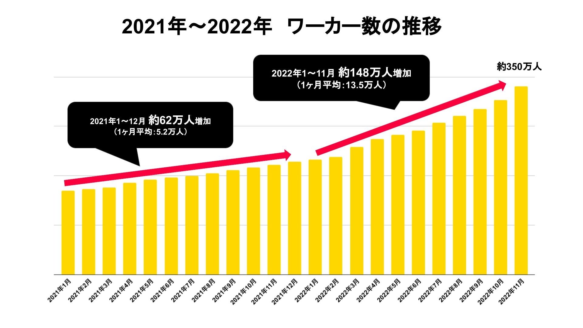 さらに、2021年と2022年のワーカー数の伸びを比較すると、2021年1~12月の間は約62万人(1か月平均5.2万人)増加していますが、2022年1~11月の間は約148万人(1ヶ月平均13.5万人)増加しており、前年比約2.6倍の増加率となりました。