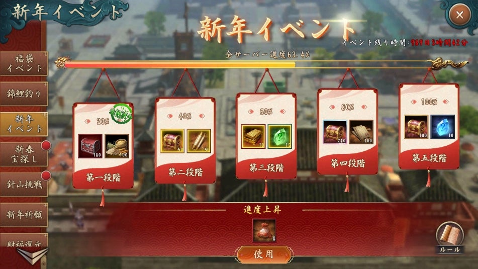 ログインボーナスで武将の好感度を獲得できる「新UR好感度宝箱(全)」など様々なアイテムを獲得できます。合計10日間ログインして「新UR好感度宝箱(全)」を集めると、すべてのUR武将のうちいずれか1名の武将と交換可能な量の好感度を獲得可能です。