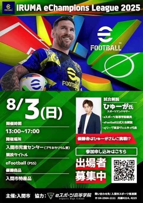入間市スポーツ振興まちづくり条例に則り、「スポーツがつくる活気あふれるまち」を目指す入間市は、2025年8月3日、同市児童センターのプラネタリウム室で、市主催としては初となるeスポーツ大会「IRUMA eChampions League 2025(競技タイトル:eFootball)」を開催しました。進行・解説は入間市スポーツアンバサダーのひゅーが氏(eFootball世界大会での公式解説実績) が務め、市内外から10名が参加しました。会場には子どもたちを中心に観戦者が集まり、地域の新たなスポーツ体験として関心を集めました。
