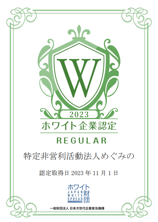 特定非営利活動法人めぐみの2023年11月1日に「ホワイト企業認定 レギュラーランク」を取得されました!