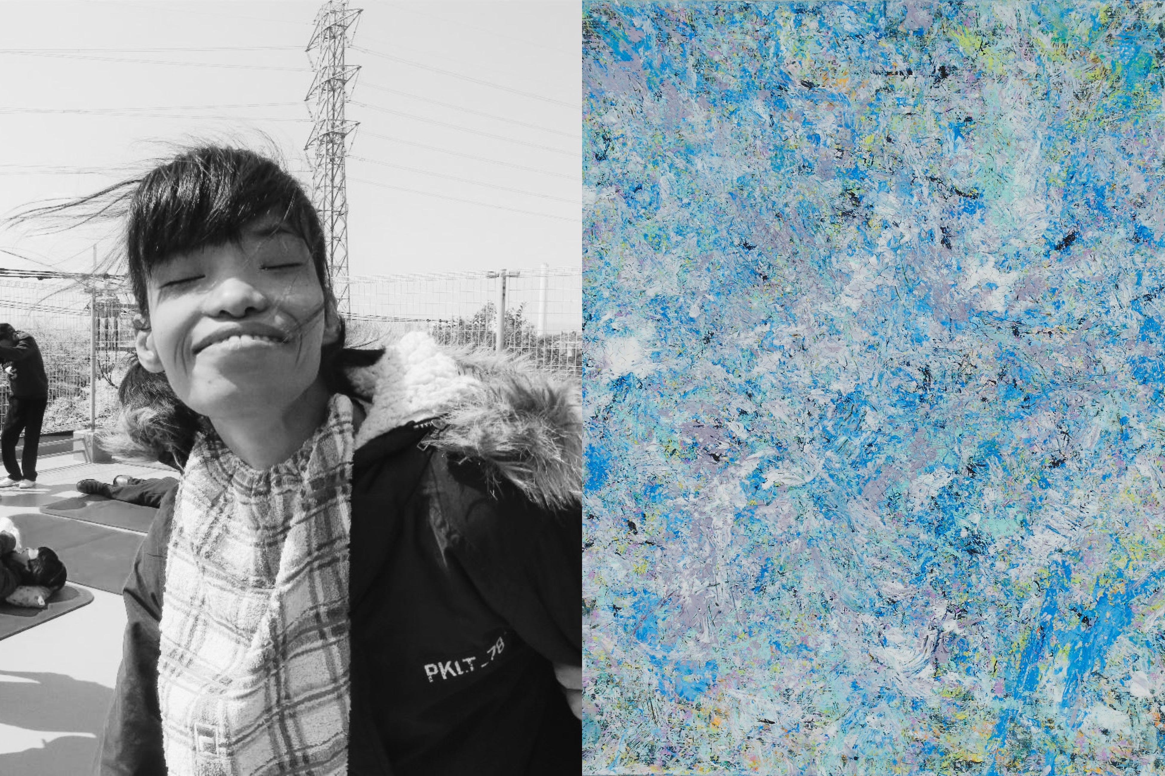 歩くことが大好きで車椅子に座っていても気分が良くなると両足がぴょんぴょんと跳ねる。絵画の時間も歩きながら鈴の音がする筆を持って、叩くように時に撫でるように楽しみながら絵を描く。踊るように描く様子は楽しさを連想させる。弾けるタッチで楽しかった思い出が蘇っているようだ。