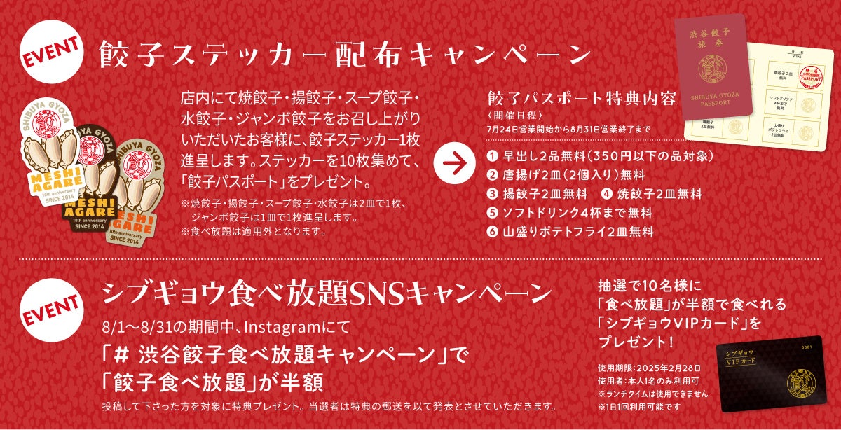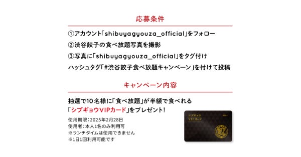 シブギョウ食べ放題SNSキャンペーンと銘打ちまして、8月1日からの期間中にInstagramにて「食べ放題」を皆様で楽しんでいらっしゃる投稿をしていただきますと、なんと期間限定で「渋谷餃子の食べ放題」が半額で食べれる『シブギョウVIPカード』が抽選で10名様に当選いたします!