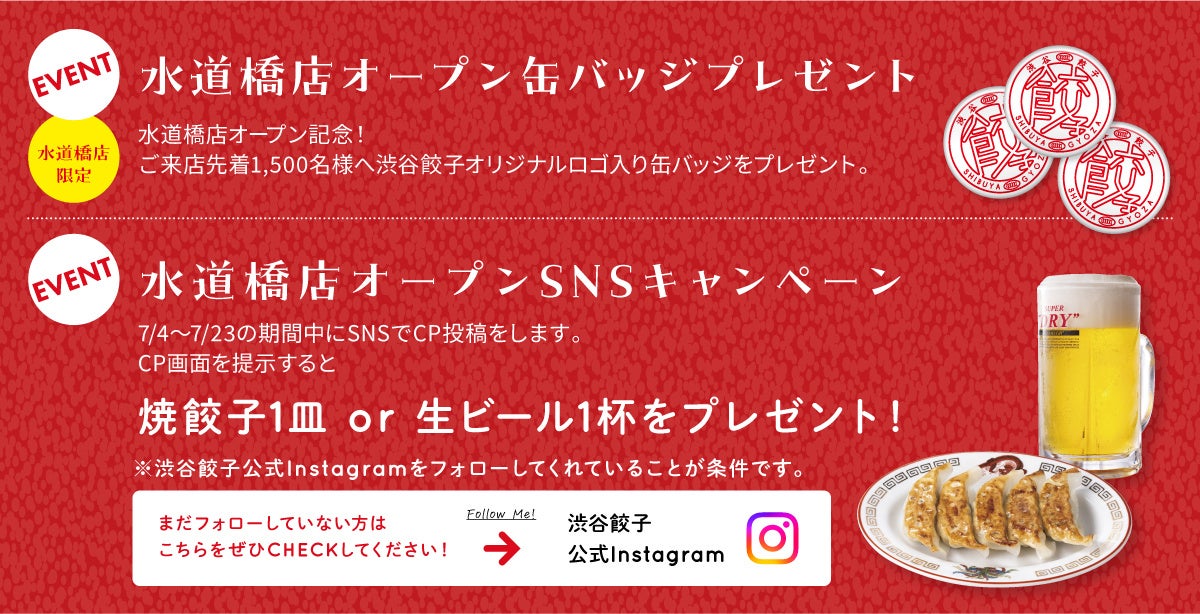 渋谷餃子 水道橋店オープンを記念しまして、渋谷餃子公式Instagramのフォロワー様限定で、公式から投稿するキャンペーン画面を提示頂くと「焼餃子1皿」or「生ビール」をプレゼントいたします!