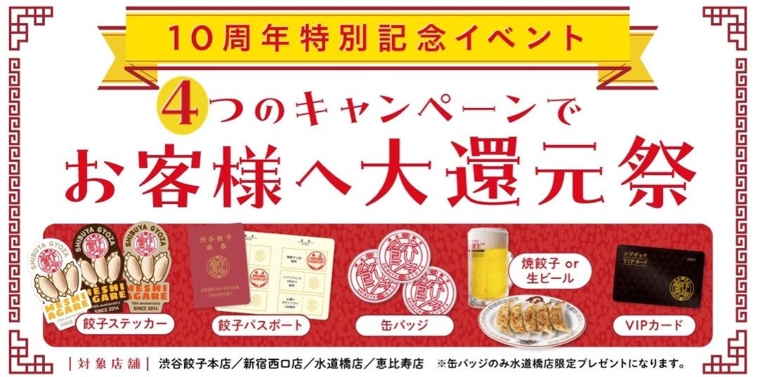 【渋谷餃子全店対象】10周年特別記念イベント開催~4つのキャンペーンでお客様へ大還元祭~