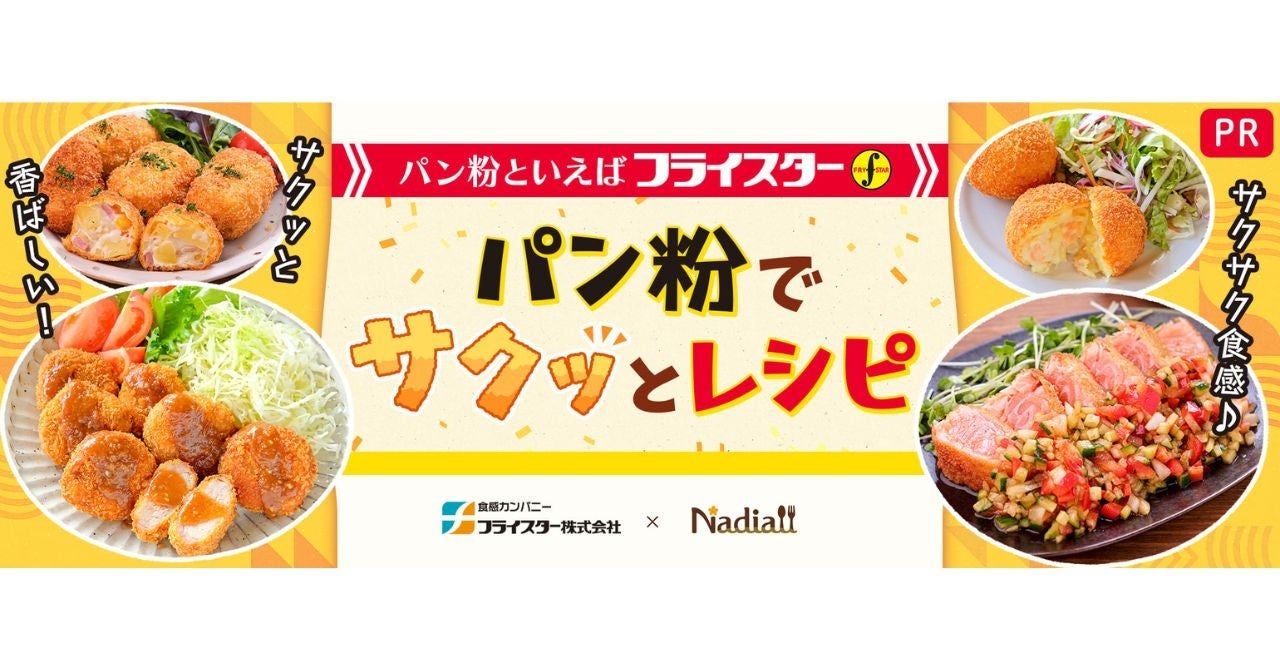Nadia株式会社(東京都港区/代表取締役社長 葛城嘉紀 以下「Nadia」)とフライスター株式会社(神奈川県横浜市/代表取締役社長 関全男 以下「フライスター」)がタイアップし、フライスター社乾燥パン粉や生パン粉の認知・消費拡大を目的に、特別企画ページ「パン粉でサクッ!とレシピ」を公開いたします。