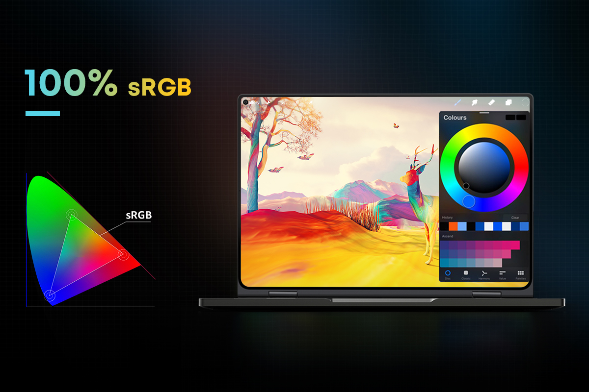 パネルは最大8ビットをサポートしており、長時間作業しても目が疲れにくくなっています。最大輝度380ニット、sRGBカバー率100%ですので、実物に近い色鮮やかな画面を楽しめます。