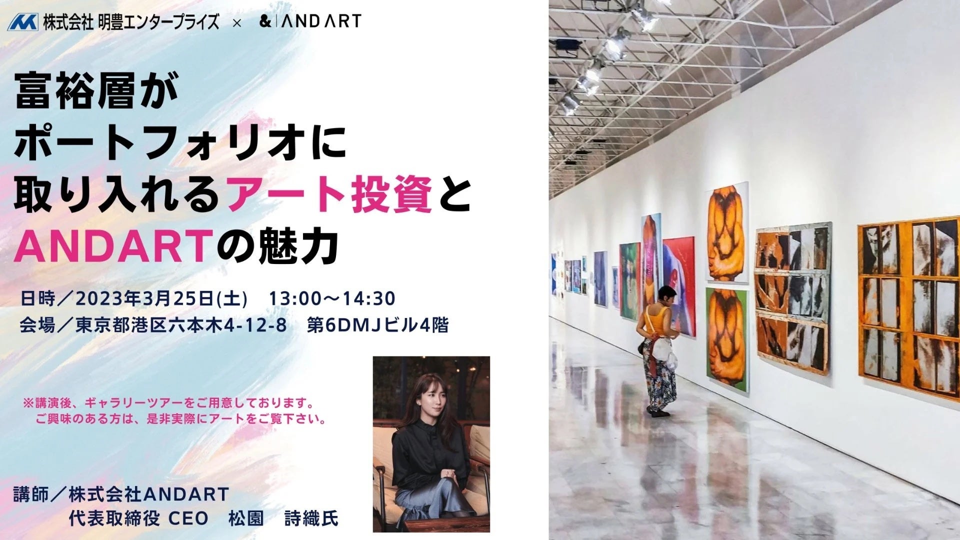 日本初のアートの共同保有プラットフォーム「ANDART (https://and-art.jp/)」や、アートのコンサルティングサービス「ANDARTコンシェルジュ (https://lp.and-art.jp/private_sales/)」を運営する株式会社ANDART(本社:東京都港区、代表取締役CEO:松園詩織)は、株式会社明豊エンタープライズ(本社:東京都目黒区、代表取締役:矢吹満、以下「明豊エンタープライズ」)とコラボレーションし、アートを実際に巡る「富裕層がポートフォリオに取り入れるアート投資とANDARTの魅力」セミナーを3月25日(土)両社で初開催いたします。セミナーでは当社代表取締役CEO松園が登壇し、アート投資のポイントや資産性について解説いたします。