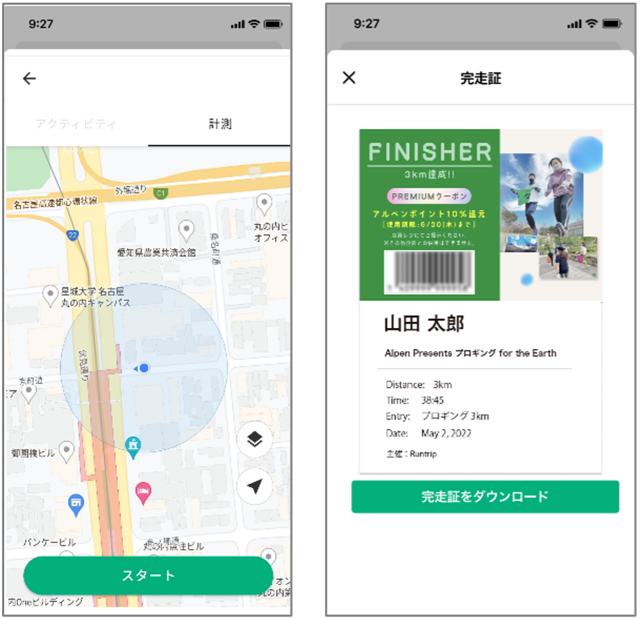 バーチャルレースの目標3㎞のプロギングを完走した方には、アプリ上で完走証の発行と合わせて、全国のアルペングループ店舗で使えるアルペンポイント10%還元クーポンをプレゼントいたします。
