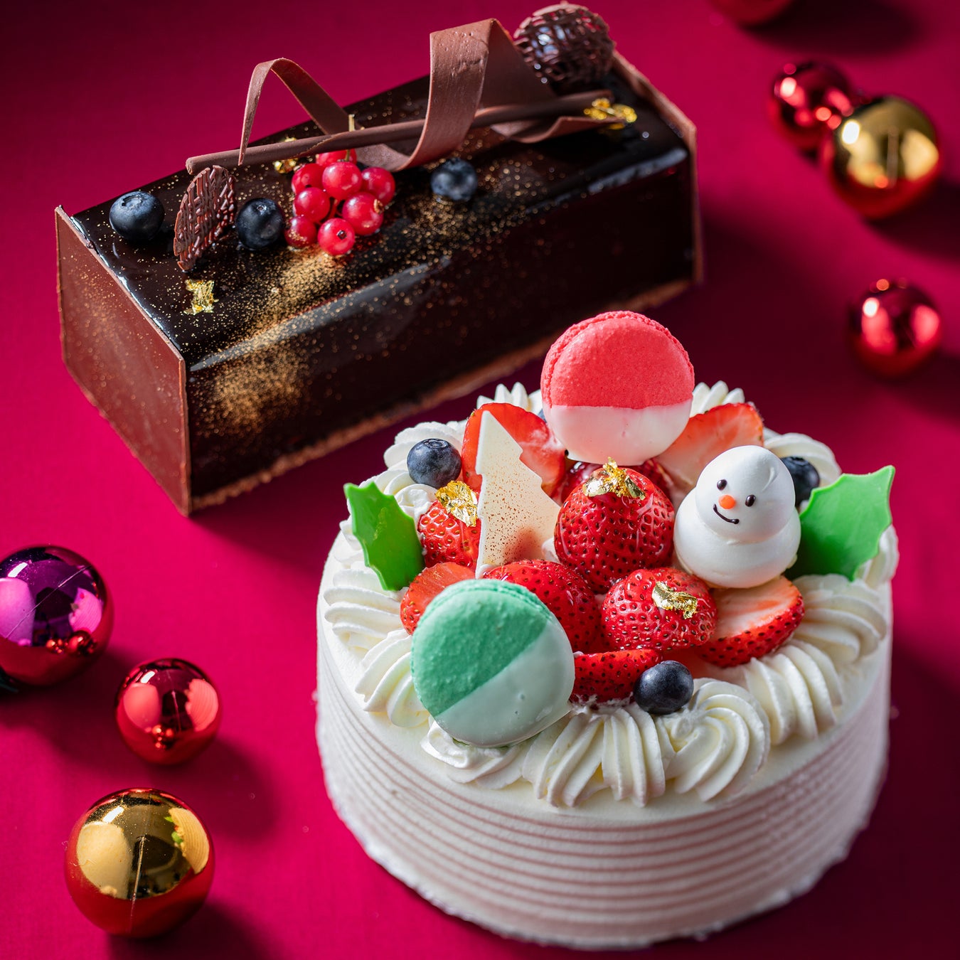 マカロンやスノーマンなどで彩ったお子様が喜ぶカラフルなショートケーキと、東京産ブルーベリーを使用した苦味と甘味が残る大人な味わいのチョコレートケーキ