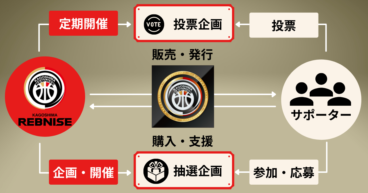 鹿児島レブナイズのトークンは”レブナイズトークン”としてFiNANCiE上で発行されます。トークンを購入いただいた方々は、運営の一部に携われる投票企画への参加や特典抽選などへ応募いただくことができます。