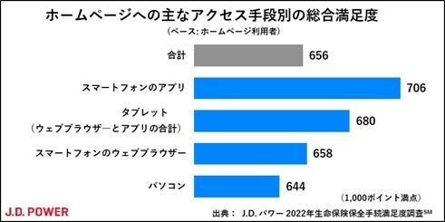 アクセス手段別に総合満足度を見ると、「スマートフォンのアプリ」の場合が最も高く(706ポイント)、次いで「タブレット(ウェブブラウザーとアプリの合計)」(680ポイント)、「スマートフォンのウェブブラウザー」(658ポイント)、最も低いのは「パソコン」(644ポイント)となった。ホームページのアクセス手段の中心となっている「パソコン」や「スマートフォンのウェブブラウザー」を利用した場合、総合満足度はあまり高くない。