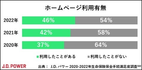 保全期間中に保険会社のホームページを閲覧/利用した顧客は年々増加している。2020年にはホームページ利用率は37%、2021年には42%であったが、本調査では46%と毎年5ポイント程度増加している。