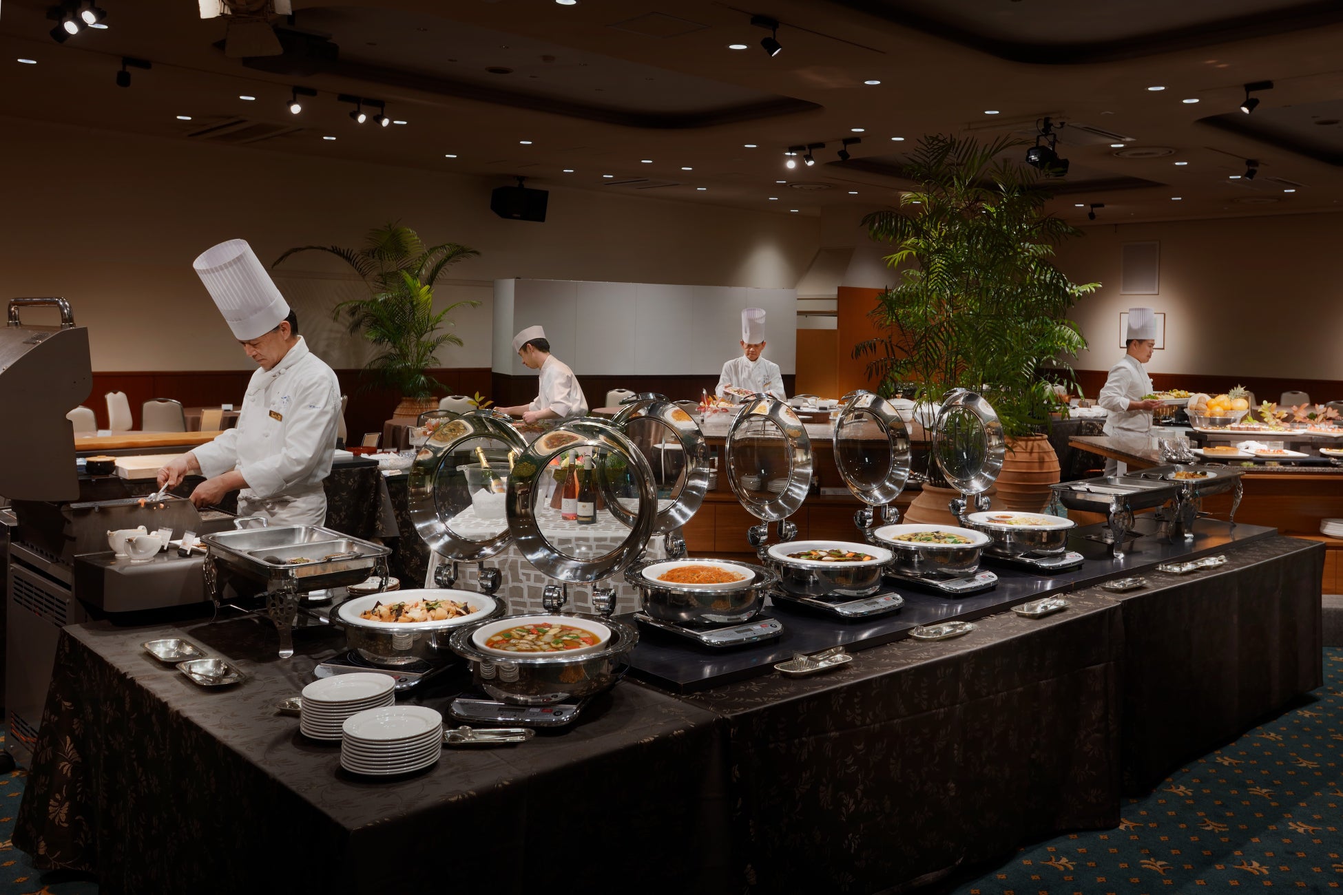 三重県産あおさ豚や檜扇貝、伊勢真鯛など地元の食材を使ったお料理や、ライブ感あふれるシェフズコーナーでは、牛肉のサイコロステーキなどを提供いたします。