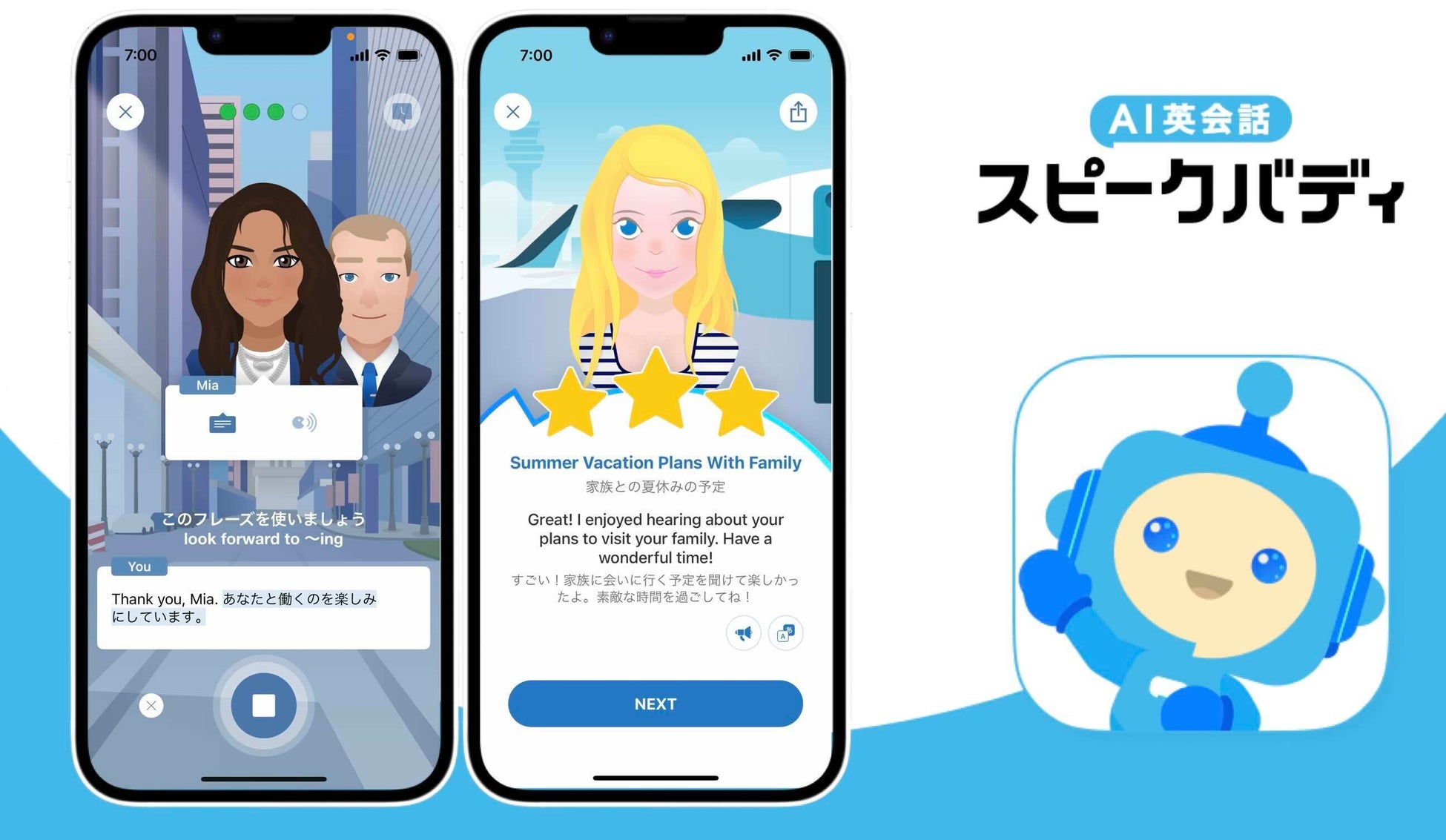 2016年9月にリリースした日本発のAI英会話アプリ。第二言語習得理論と、音声認識や生成AI・デジタル音声・自然言語処理など最新のAI技術を融合させた学習体験は高く評価され、2026年1月時点でApp Storeの評価は「4.6」を獲得。累計ダウンロード数は500万を超え、企業や自治体、教育機関などでも累計300を超える導入実績があります。