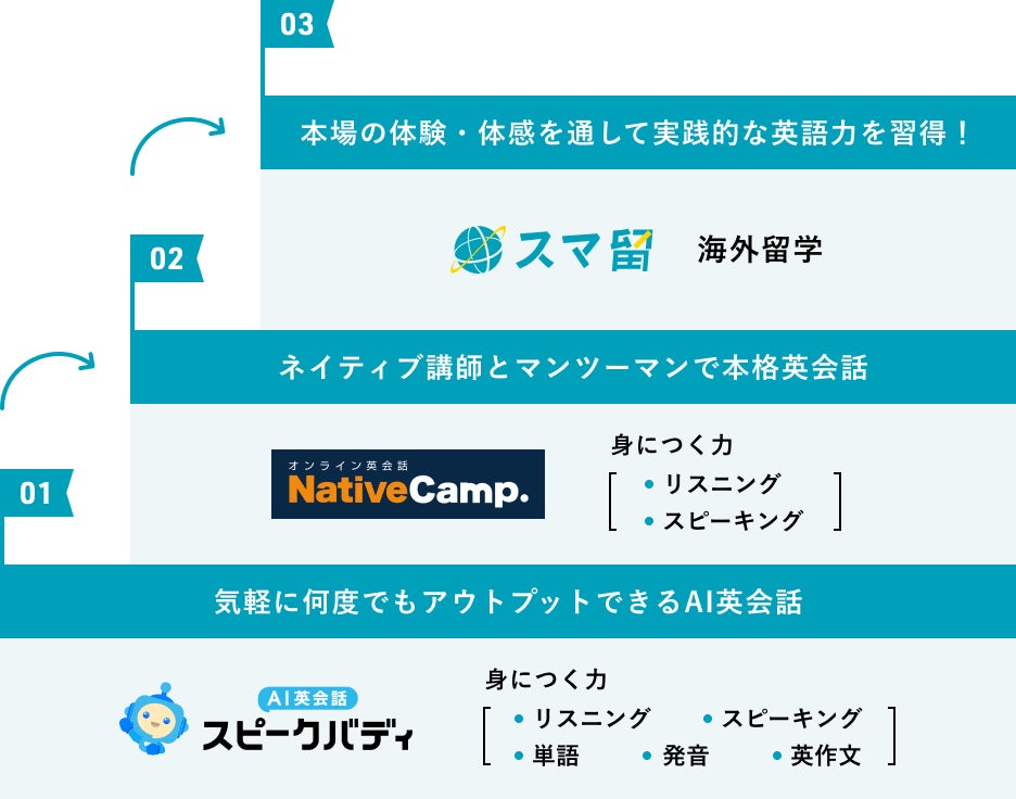 スマ留では、英語学習サポートを強化しており、最短での語学力向上を目指せます!3つのサービスを組み合わせ、最短で英語習得を可能にしたのがスマ留独自のメソッドです。