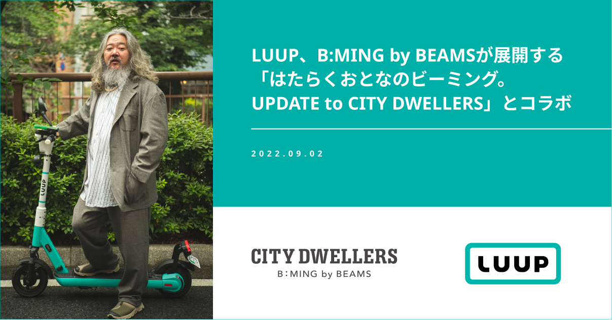 株式会社Luup(本社:東京都渋谷区、代表取締役社長兼CEO:岡井大輝)が提供する電動マイクロモビリティのシェアリングサービス「LUUP」は、BEAMSのライフスタイルレーベル「B:MING by BEAMS」が展開する新プロジェクト「はたらくおとなのビーミング。 UPDATE to CITY DWELLERS」とコラボレーションしました。今回、LUUPの電動キックボードが、2022年9月2日(金)公開の「CASE03」の記事にストレスフリーで便利に移動できる手段として登場しています。また、コラボを記念し、B:MING LIFE STORE by BEAMSの一部店舗にて同日よりLUUPの特別クーポンの配布を行います。