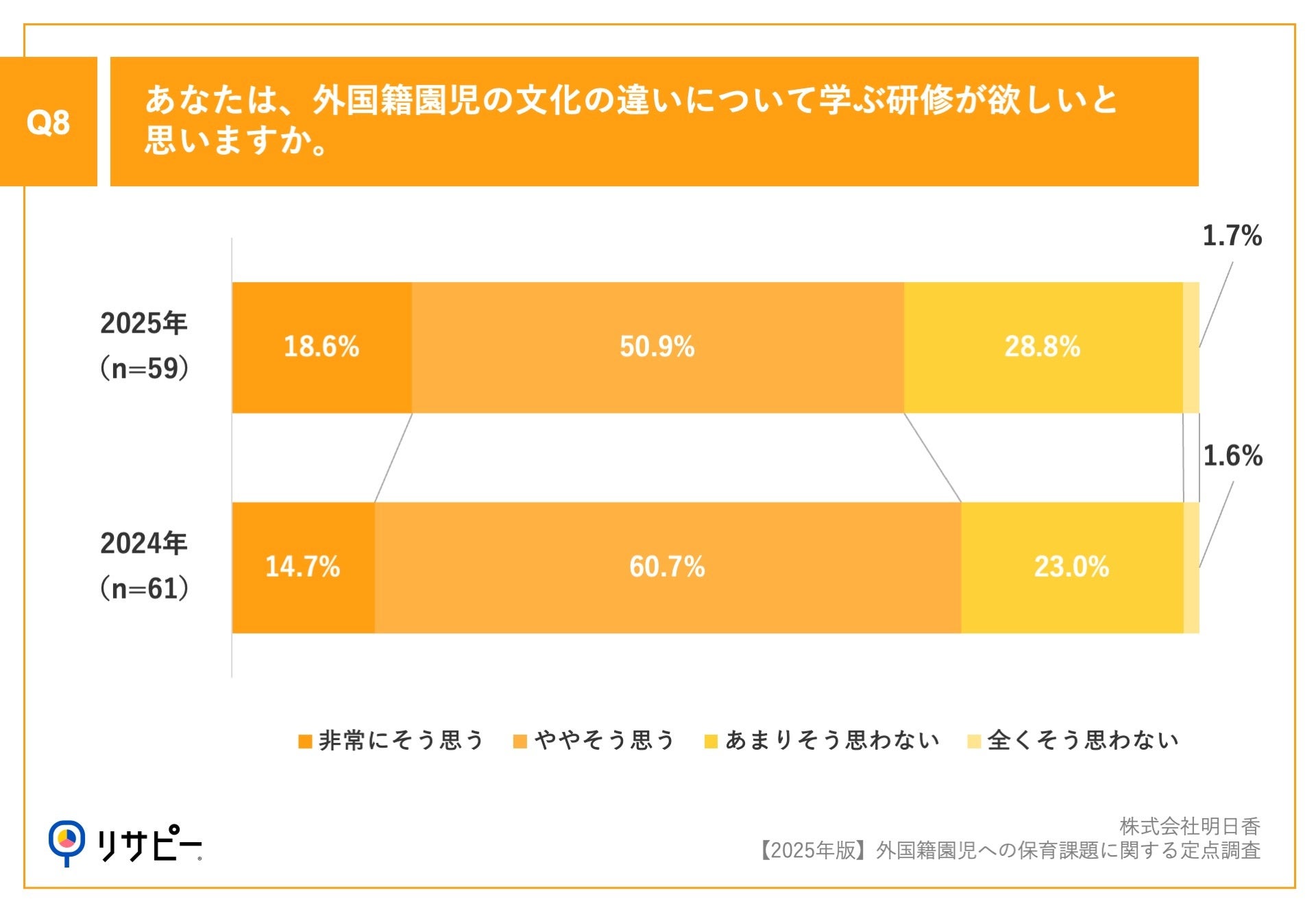 Q7で「ない」と回答した方に、「Q8.あなたは、外国籍園児の文化の違いについて学ぶ研修が欲しいと思いますか。」(n=59)と質問したところ、「非常にそう思う」が18.6%、「ややそう思う」が50.9%という回答となりました。