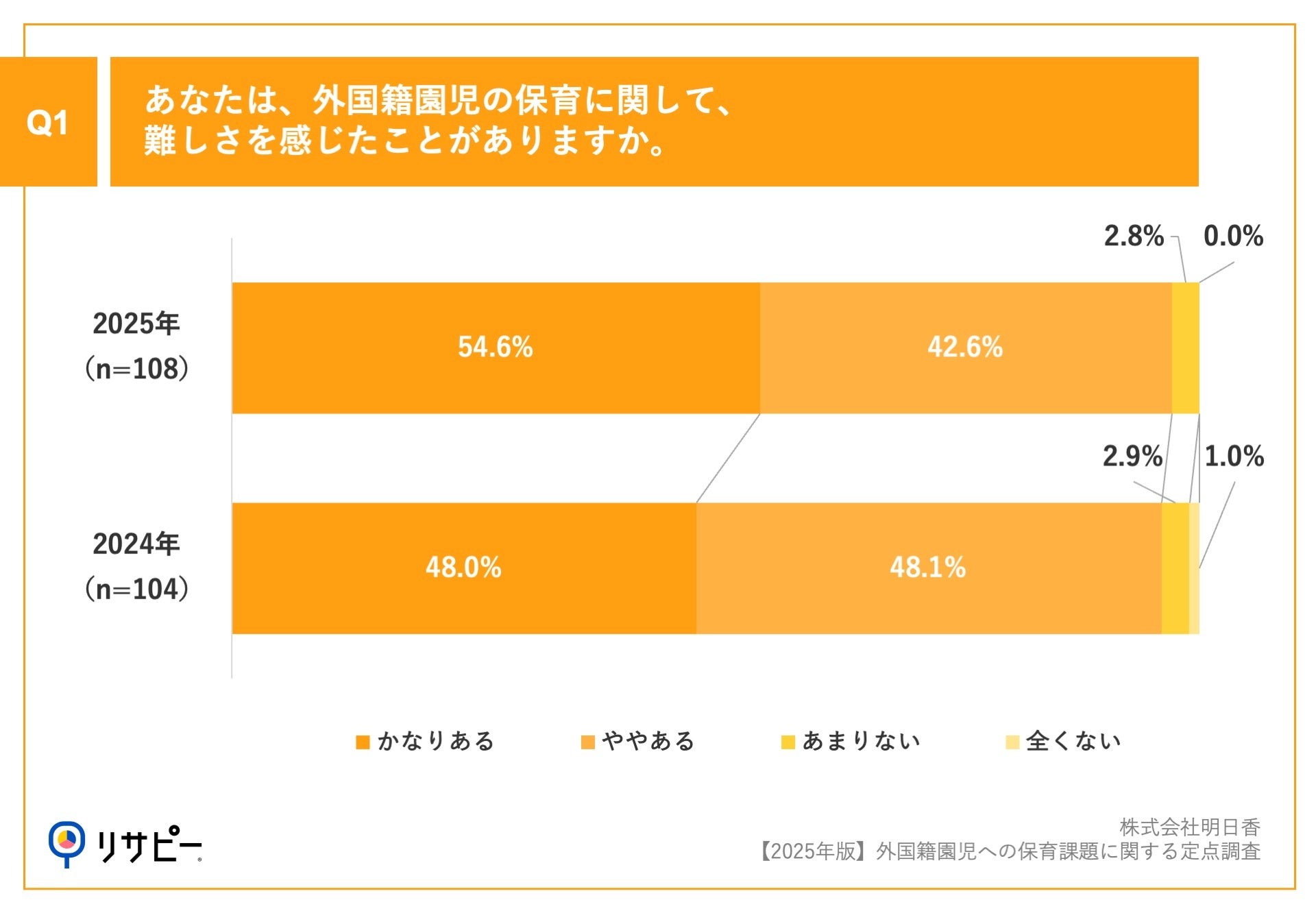 「Q1.あなたは、外国籍園児の保育に関して、難しさを感じたことがありますか。」(n=108)と質問したところ、「かなりある」が54.6%、「ややある」が42.6%という回答となりました。