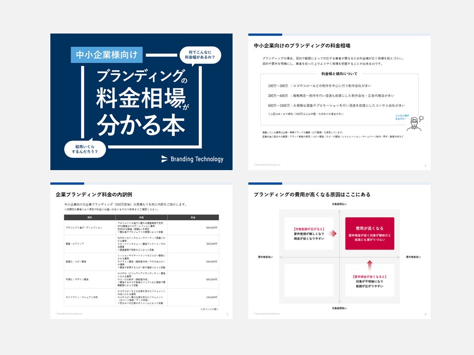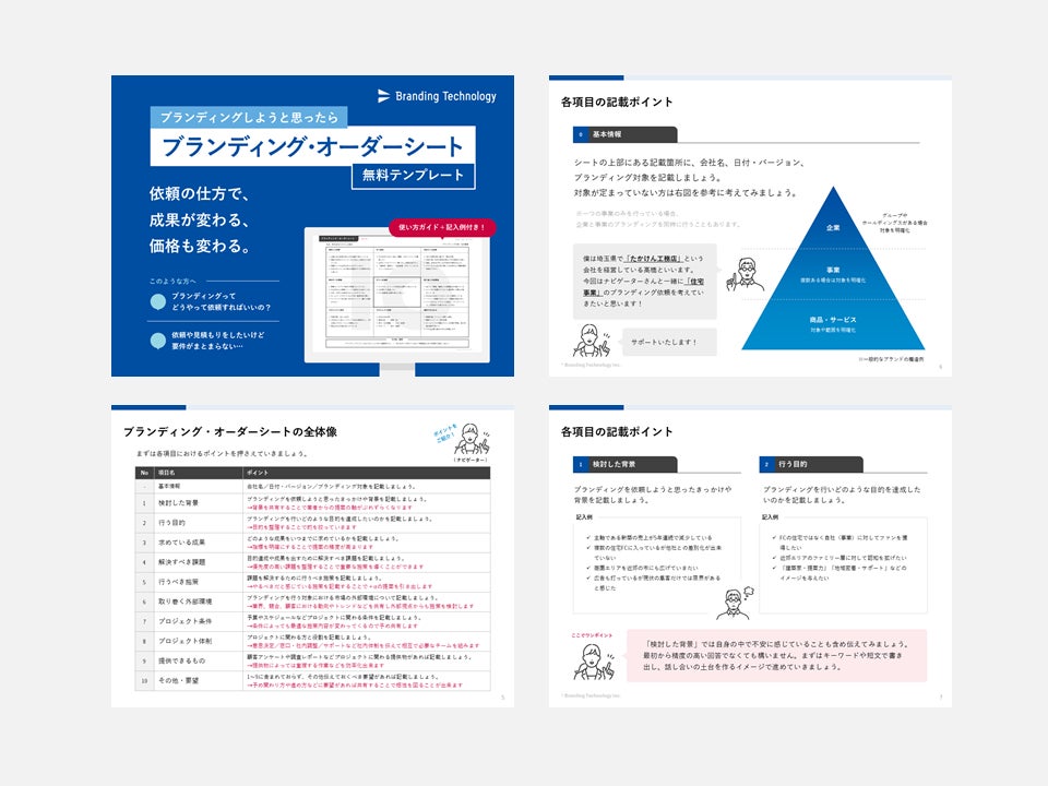 今回はその活動の一環として『ブランディング・スターターガイド』を作成しました。要件整理に活用できる“ブランディング・オーダーシート”と“ブランディングの料金相場が分かる本”を収録しています。是非この機会にダウンロードしお役立て下さい。