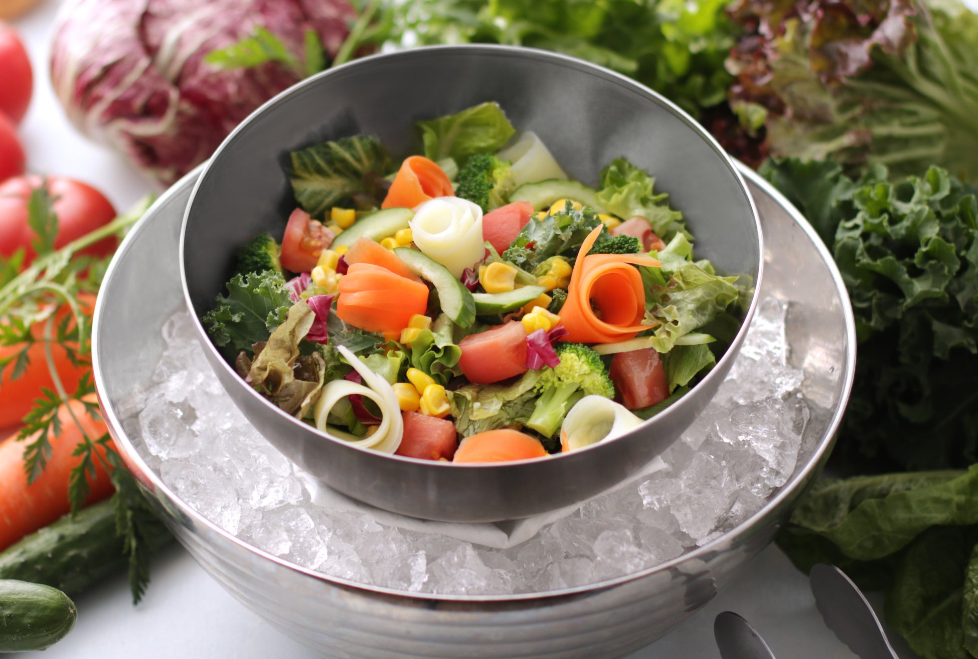 氷で冷やしながら提供するサラダは最後まで冷たくシャキシャキ!見た目も楽しい彩り豊かな12種類のお野菜をお楽しみください。