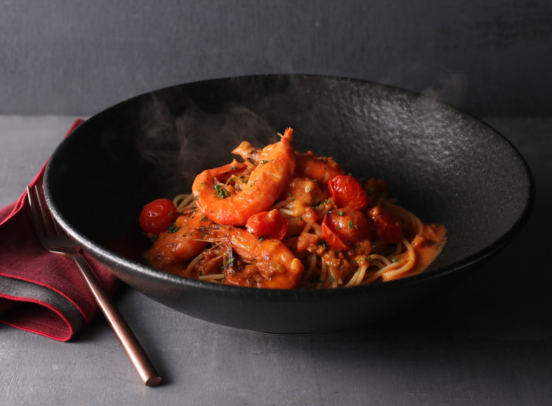 シェフのこだわりポイントは海老を殻ごと調理すること。そうすることで海老の香ばしさと、旨みを閉じ込めた濃厚なトマトクリームソースが仕上がります。あたまからしっぽまで食べられる海老を存分に楽しめるパスタです。