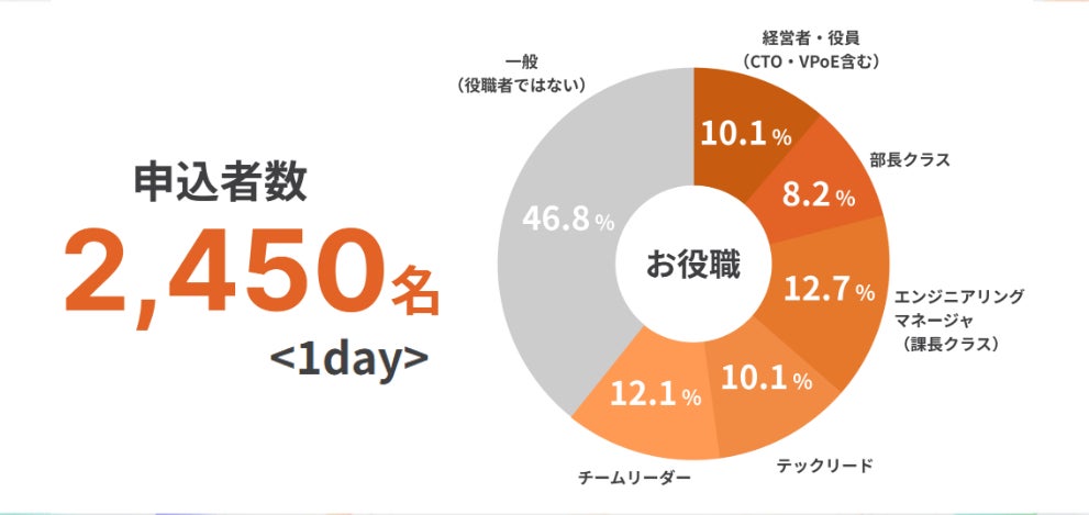 さらに、お申込者・現地参加者ともに約60%が、リーダーやエンジニアリングマネージャー(EM)以上の職種・役職層で構成されており、アーキテクチャに関する意思決定者層へリーチできる貴重なイベントです。