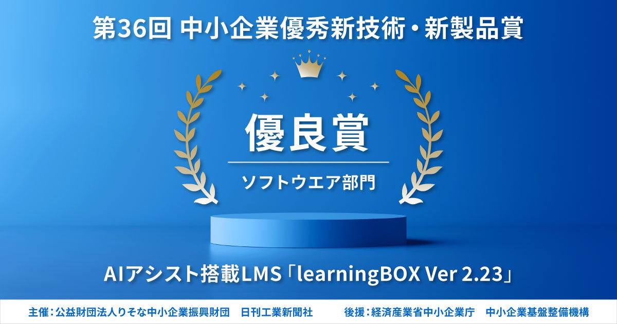 learningBOX(ラーニングボックス)株式会社(本社:兵庫県たつの市、代表取締役:西村 洋一郎)は、公益財団法人りそな中小企業振興財団(以下、りそな中小企業振興財団)と日刊工業新聞社(以下、日刊工業新聞)が主催する「第36回中小企業優秀新技術・新製品賞」にて、「learningBOX Ver 2.23」がソフトウエア部門・優良賞を受賞したことをお知らせいたします。