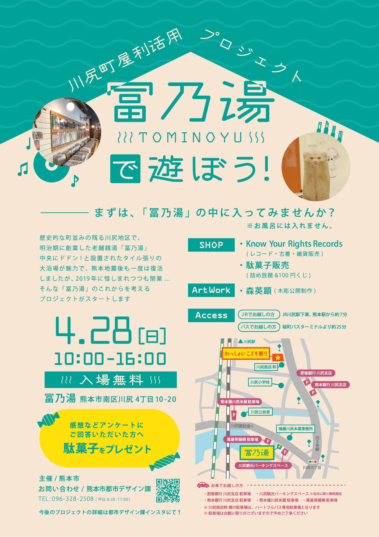 今後の実証実験における利活用のアイデアを募るため、プレイベントとして、令和6年(2024年)4月28日(日)に、川尻町屋利活用プロジェクト「冨乃湯で遊ぼう!」を開催します。