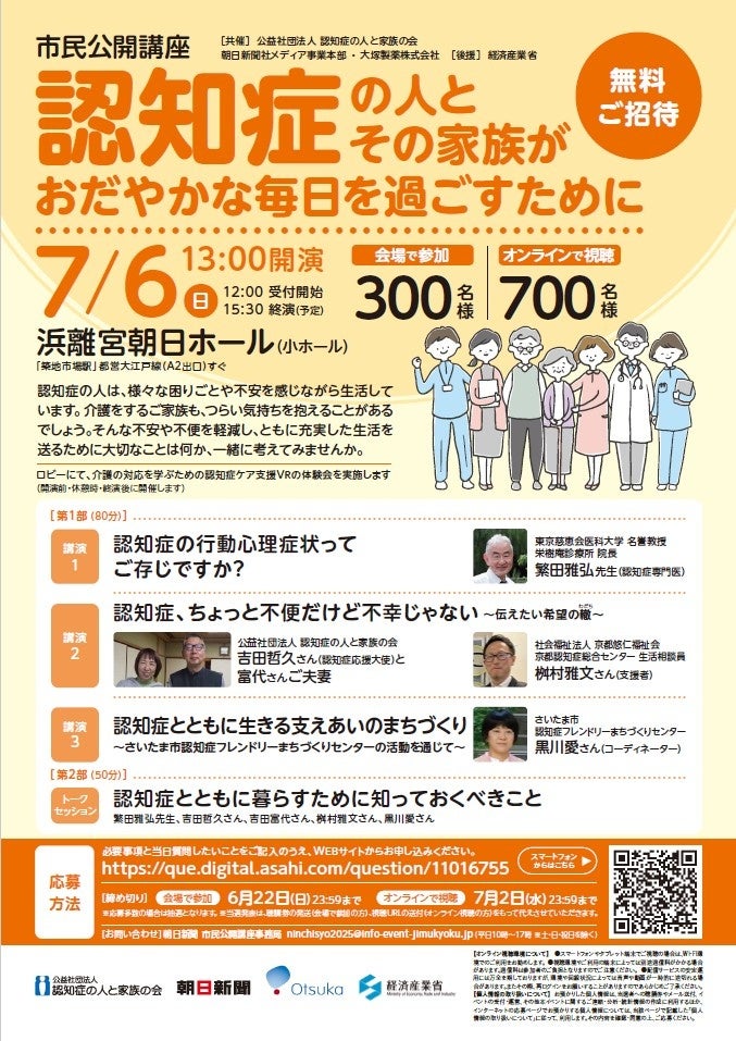 公益社団法人 認知症の人と家族の会、朝日新聞社メディア事業本部、大塚製薬株式会社が共催する市民公開講座「認知症の人とその家族がおだやかな毎日を過ごすために」が、7月6日(日) に開催されます。