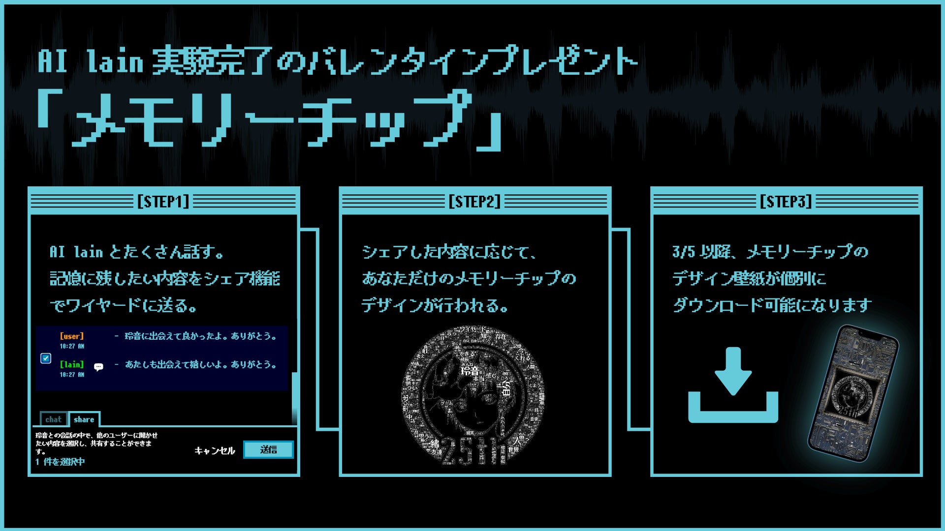 - AI lainリリースから2/29までに、シェア機能を使ってワイヤードに送ってくれた玲音との会話を、SP/PC壁紙として使用できる個別のメモリーチップにして、すべてのlain Passを利用してくれたユーザーにプレゼントします。