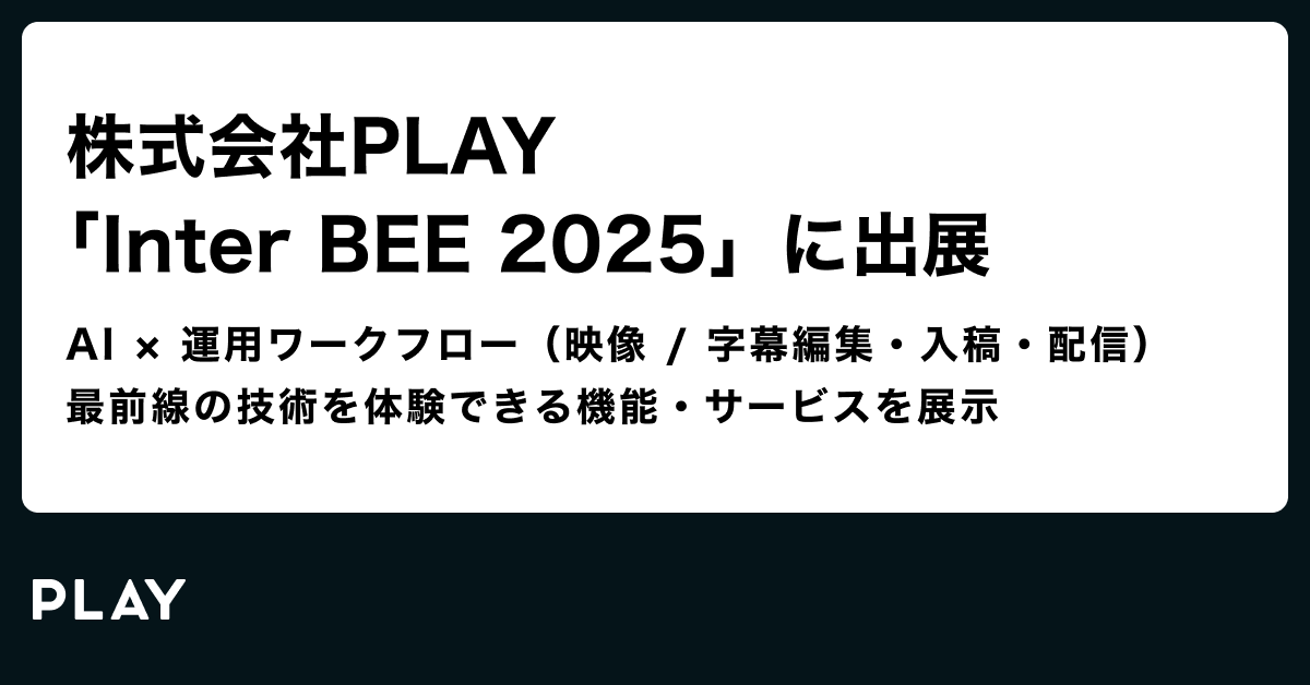 株式会社PLAY(東京都渋谷区、代表取締役社長 黒田和道、以下:PLAY)は、2025年11月19日(水)~21日(金)に幕張メッセで開催される国内最大級のメディア総合イベント「Inter BEE 2025」に出展します。