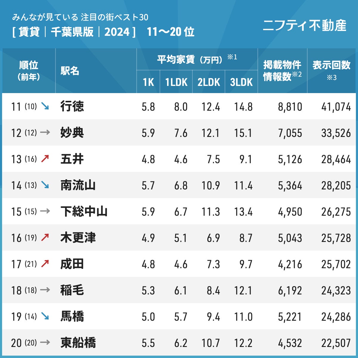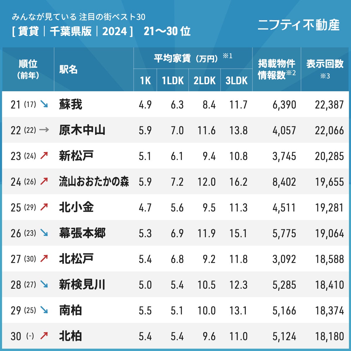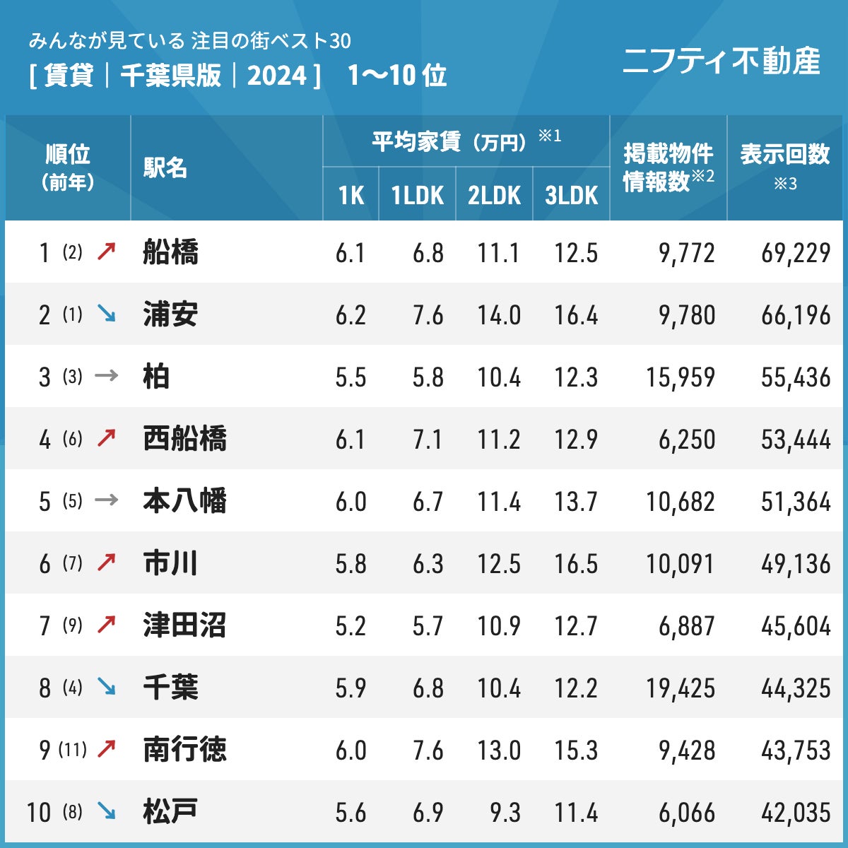 【お部屋探しならニフティ不動産】「千葉の賃貸物件探しで注目の街ランキングベスト30」を発表(2024年調査)