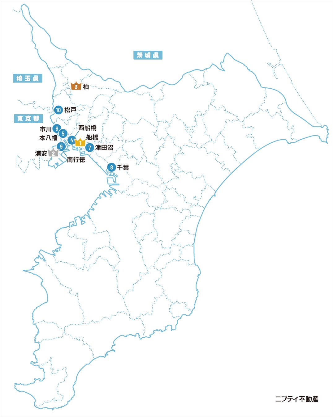 船橋エリアからはほかにもトップ10内に「西船橋」が4位にランクイン。隣接する「津田沼」も前回9位から7位へ順位を上げています。千葉と東京都心部・神奈川方面を結ぶ総武線快速・総武線沿線の交通利便性が、改めて評価されているようです。なかでも西船橋駅は5路線が利用できるターミナル駅で、1日の平均乗車人員数は県内最多(2位は船橋駅)。始発列車があるため通勤時間帯の利便性もよく、働く世代にとって魅力的。平均家賃もリーズナブルで、単身者からファミリーまで幅広く支持されているようです。