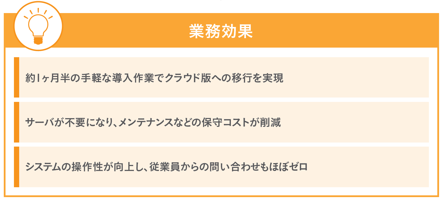 また、これまで定期的なサーバメンテナンスに一定の手間が費やされていたほか、サーバトラブルによるシステムの停止も経験されていましたが、X-point Cloudへ移行したことによってサーバが不要になり、保守コストの削減によって情報システム部への業務負荷が大幅に軽減されています。