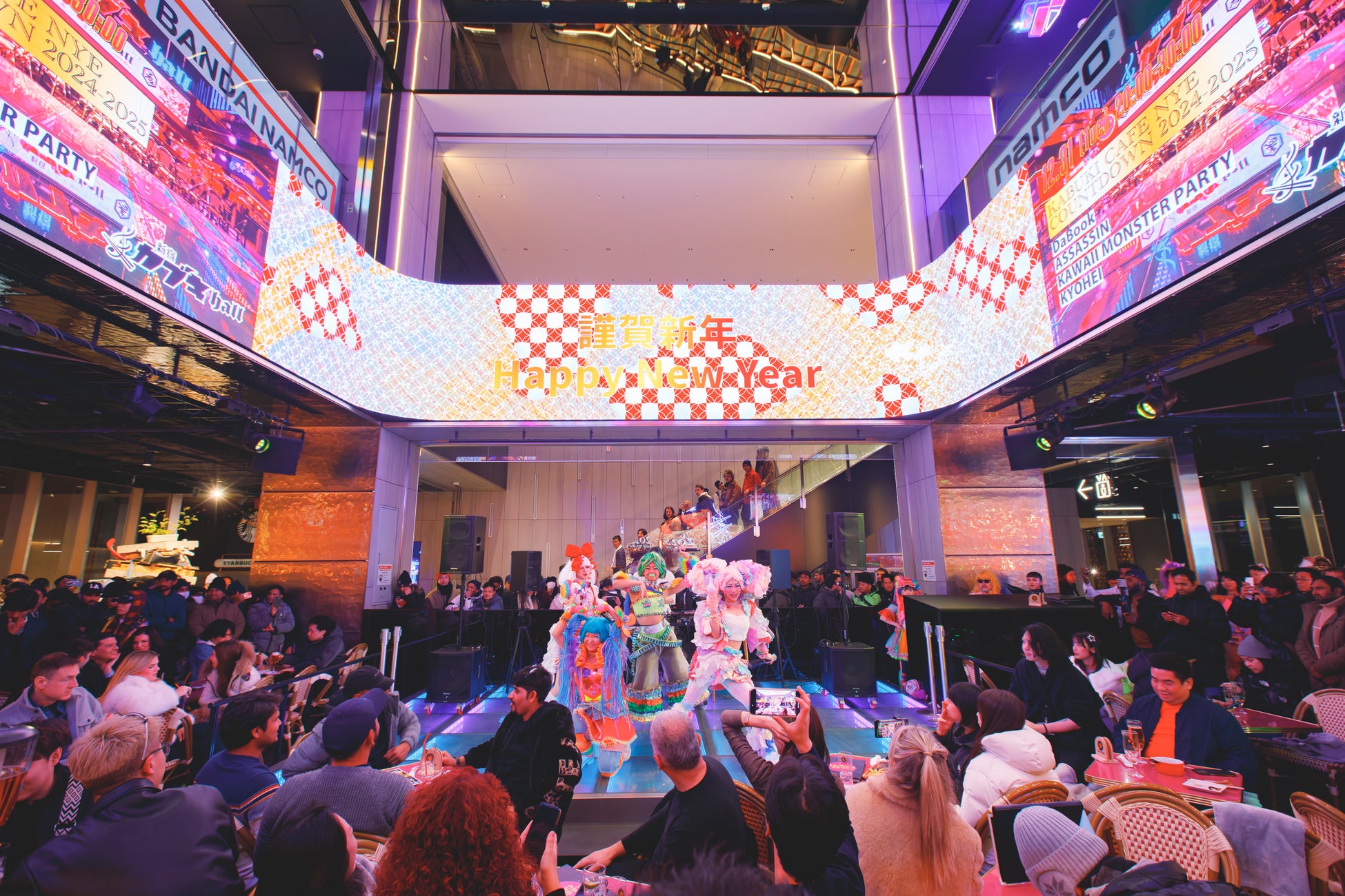 24時を回った後も本施設内はニューイヤーを祝う人々で賑わいました。2階「新宿カブキhall~歌舞伎横丁」の店舗中央ステージでは、「KAWAII MONSTER PARTY」出演者によるパフォーマンスが披露され、店内は大盛り上がり。パフォーマーたちが観客をステージ上に招くというサプライズ演出もあり、会場のボルテージはマックスに。また、3階「namco TOKYO」では、ダンスミュージックをテーマにした音楽原作キャラクタープロジェクト「電音部」のスペシャルステージを開催。DJがアニメ・ゲームソングをプレイし、国内の電音部ファンのみならず、あらゆる国のお客さまがステージを中心に盛り上がるなど、本施設全体を通して国籍を問わず様々な方にお楽しみいただける年越しイベントとなりました。