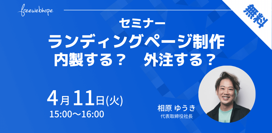 株式会社free web hope(本社:東京都中央区、代表取締役:相原ゆうき)は、無料のオンラインセミナー「ランディングページ制作 内製する?外注する?」を4月11日(火)に開催いたします。(お申込みフォーム:https://share.hsforms.com/1itGcxYjsQo61Q7PG4tcr1w5fwo5)