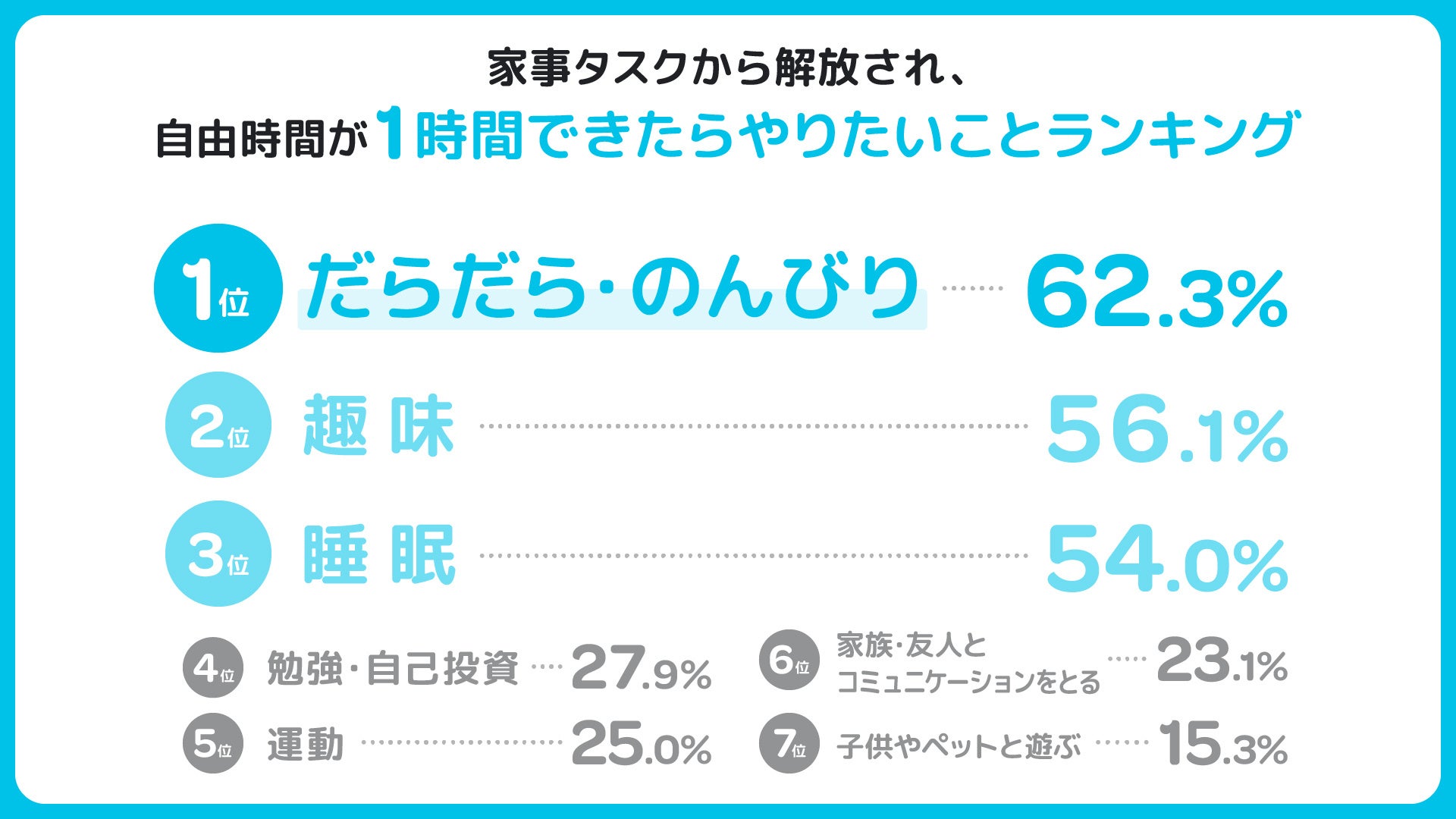家事タスクから解放され、自由時間が1時間できるとしたらやりたいことを聞いたところ、「趣味(56.1%)」や「勉強・自己投資(27.9%)」を抑え、1位は「だらだら・のんびり(62.3%)」という結果となりました。