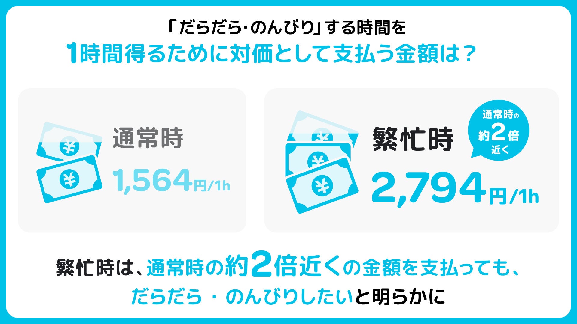 ・1時間だらだら・のんびりできる時間を得られるなら、対価として支払う平均額は「1,564円 (通常時)/2,794円(繁忙時)」。