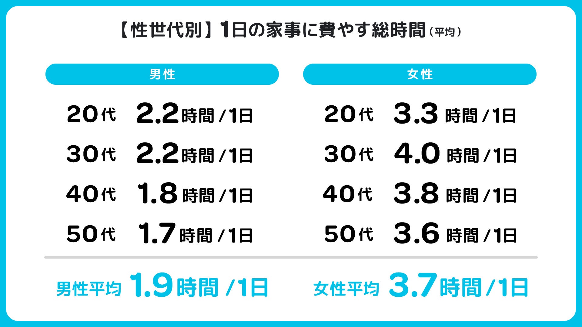 一方で、1日の家事に費やす総時間を年代別でみると、男性は全世代において2時間前後(平均1.9時間)なのに対し、女性は全世代3時間超(平均3.7時間)と約2倍の負担がかかっていることから、現代社会において、まだまだ家事負担が高くなりがちな女性ほど「だらだら・のんびり」した時間を求める傾向にあることが窺えます。