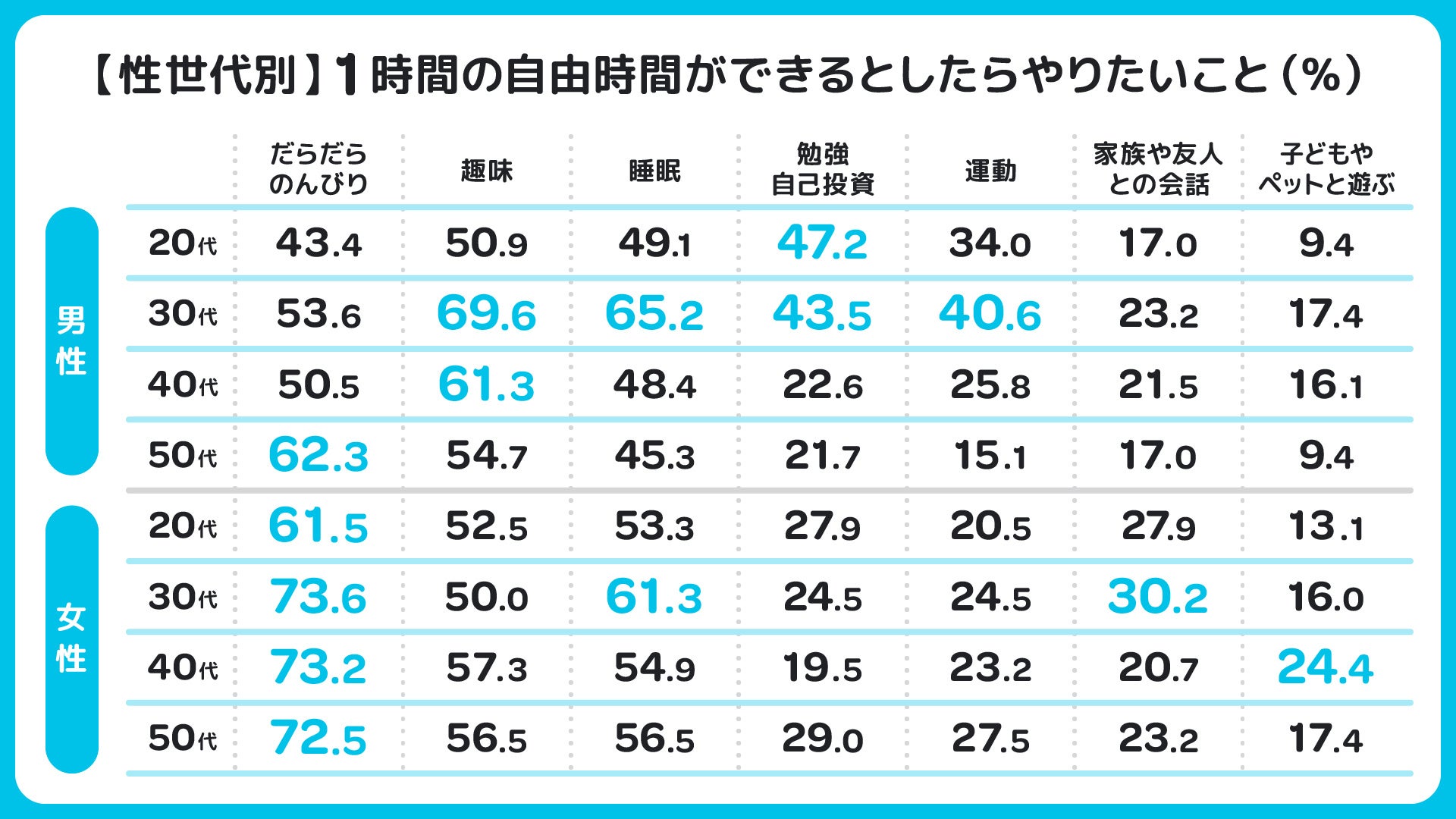 ちなみに・・・「1時間の自由時間ができるとしたらやりたいこと」を性年代別で比較すると価値観の違いが垣間見える結果に。男性は世代によって優先されるものが異なる傾向が見られ、特に20代~30代では、「勉強・自己投資」「趣味」「睡眠」「運動」など票が割れました。全体的に年齢が上がるにつれて「だらだら・のんびり」への意向が高まり、特に30代~50代女性では7割以上となりました。