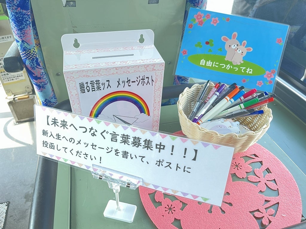 今後入学される方へのメッセージを書いていただ車内にけるようメッセージカードとペン、書いていただいたメッセージを入れるボックスを車内にご用意いたしました。お預かりしたメッセージは4月に車内に掲示して運行予定です。