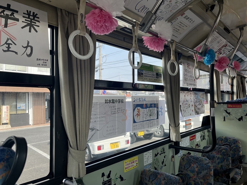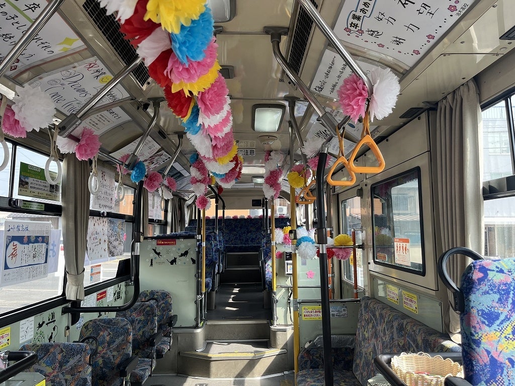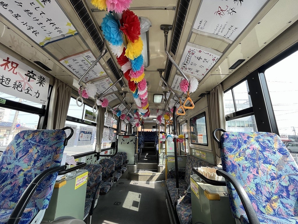 車内掲示物を贈る言葉のポスターで埋め尽くしたほか、押しボタンを押すと「バスは止まりますが、皆様は夢に向かって進んでください」と流れ、押しボタンのアナウンスまでもが背中を押す、心あたたまるバスになっております。