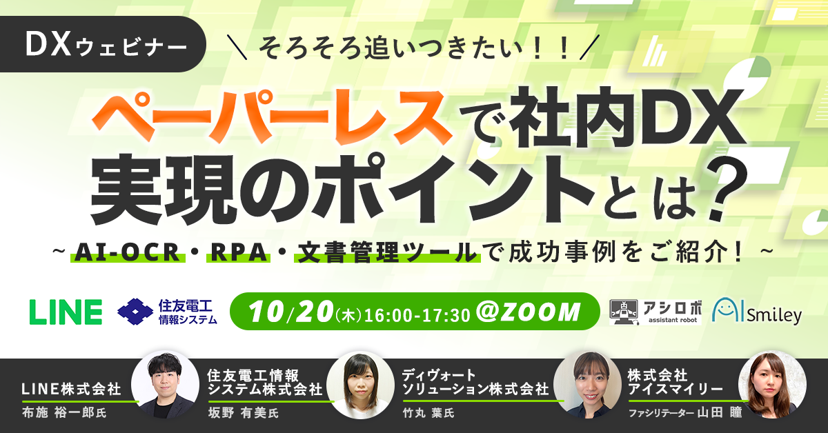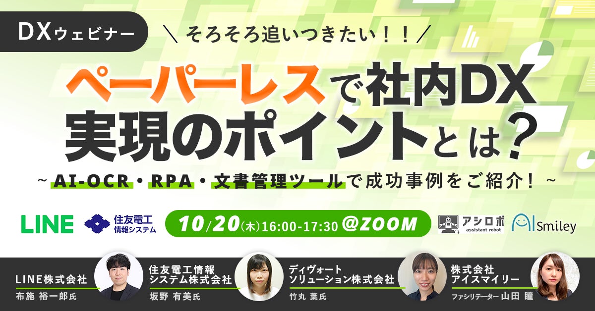 企業のDXを推進する国内最大級の AI ポータルメディア「AIsmiley」を運営するアイスマイリー(東京都渋谷区、代表取締役:板羽晃司)は、2022年10月20日(木)16時から「ペーパーレスで社内DX」をテーマにウェビナーを開催します。