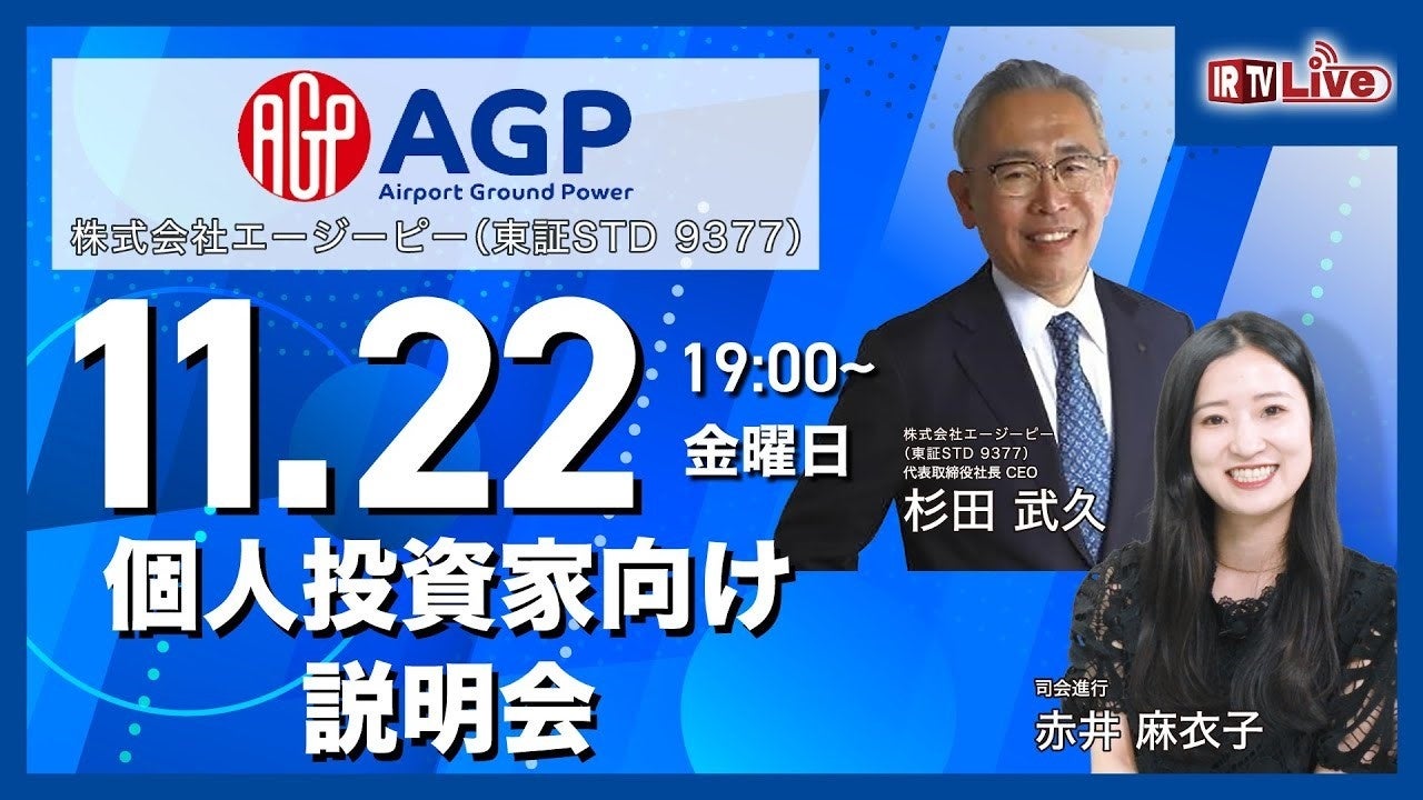 株式会社エージーピーは、2024年11月22日(金)、株式会社IR Robotics主催の『IRTV for YouTube』にて、個人投資家向け説明会を実施いたしますのでお知らせいたします。