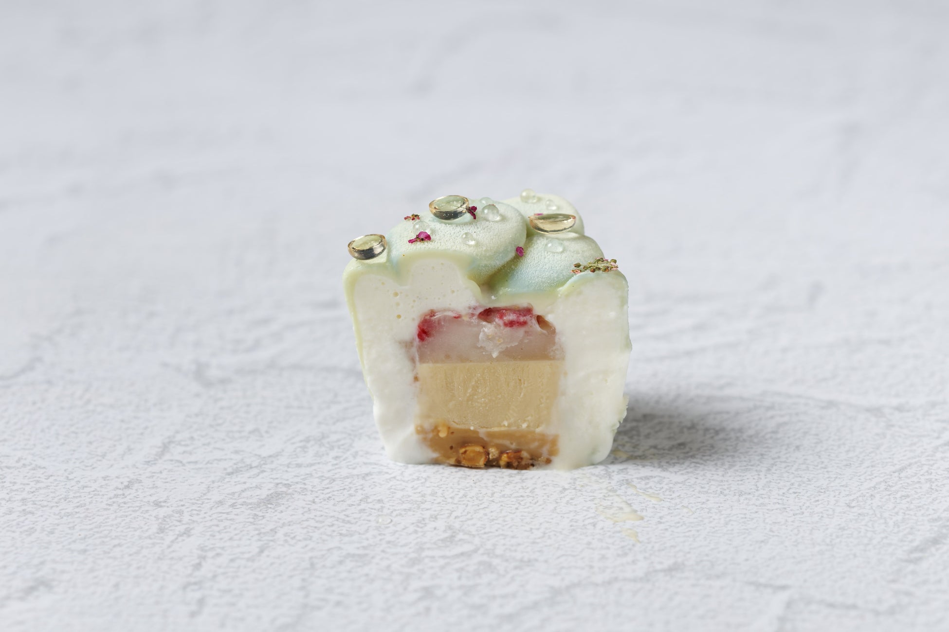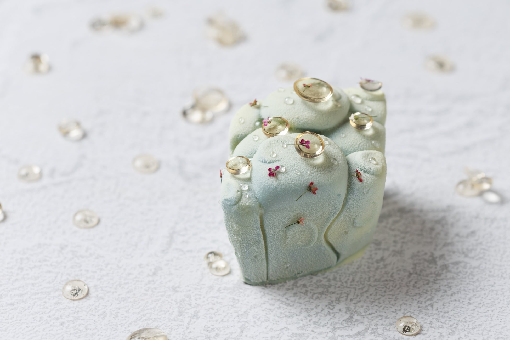青と緑の柔らかなグラデーションがかった形状は石造りの街を、そこに雨が降り生命が輝きはじめる様子を透明の雫で、ドライフラワーは乾きが潤いゆく様子を表現しました。味わいは、様々なテクスチャーのアーモンドを重ね、周りはローズとバニラの甘い香りが漂うヨーグルトムースで覆っています。