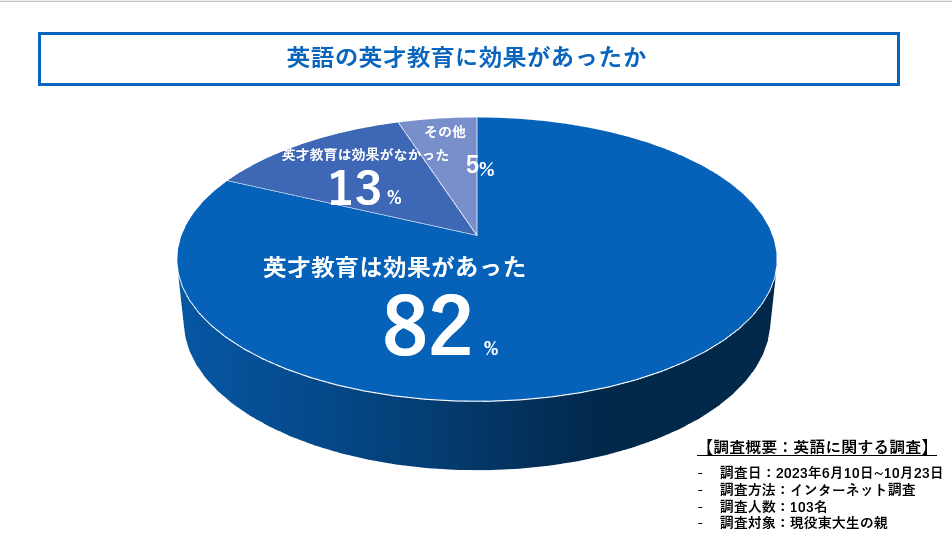 現役東大生のママの82%が、英語の英才教育の効果があったと回答しました。英語に幼少期から慣れておくことは、受験英語を勉強するときに必ず役に立ちます。特に他の受験生がつまずきやすいリスニングで、強みを発揮できるので、二次試験にリスニングがある東大入試では、かなり有利に働くでしょう。