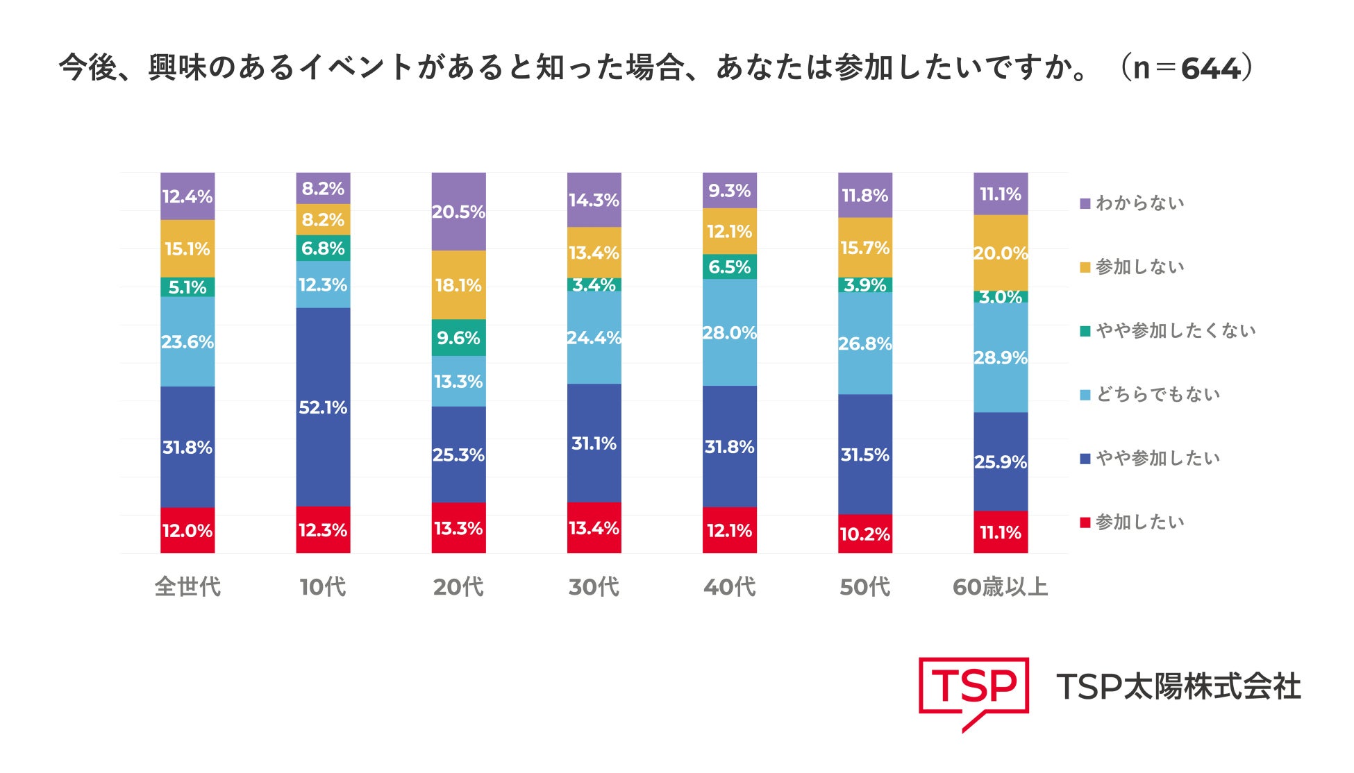 世代別の結果では、10代の「参加したい」「やや参加したい」と回答した人の割合が64.4%と最も高く、イベントへの参加意欲が他の世代と比較して高い傾向にあることがわかりました。