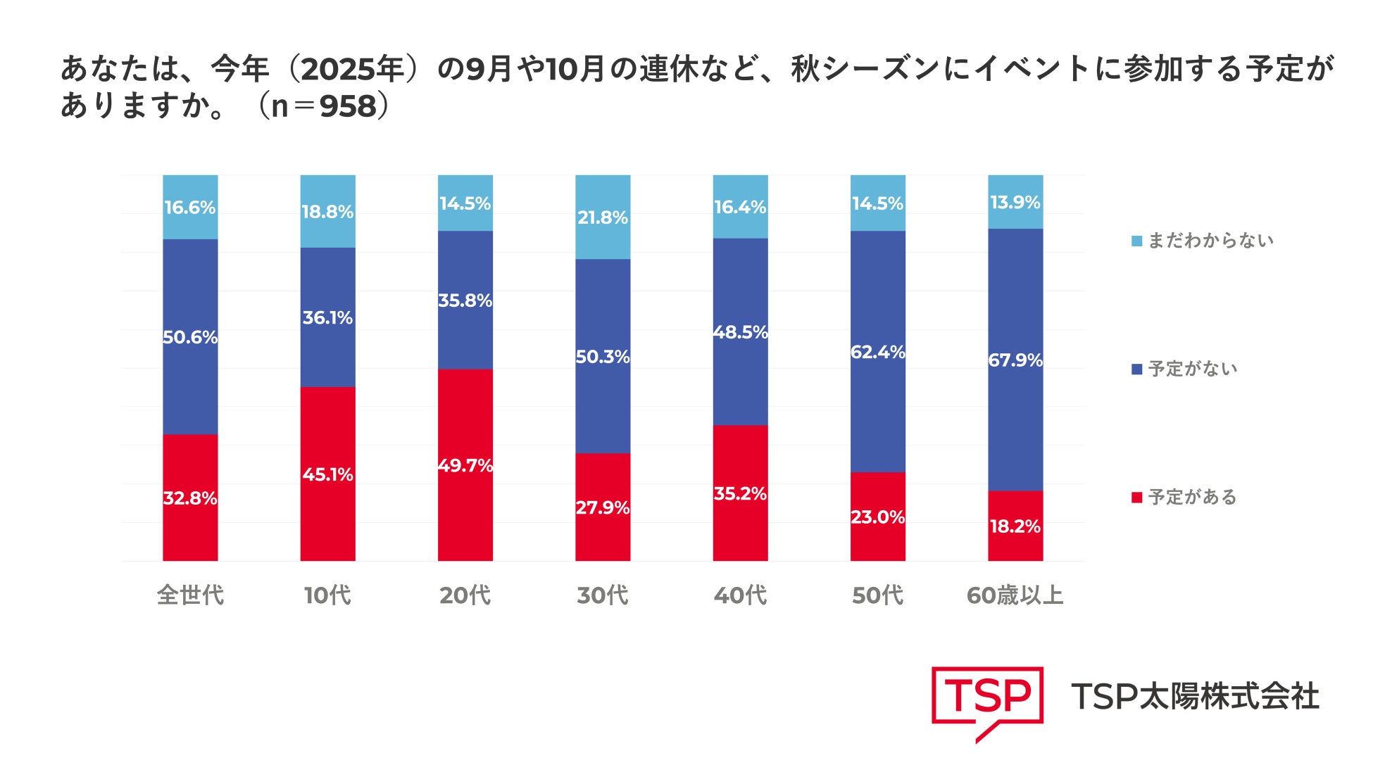 世代別の結果では、10代の45.1%、20代の49.7%が「予定がある」と回答。一方で30代の50.3%、40代の48.5%、50代の62.4%、60歳以上の67.9%が「予定がない」と回答しました。10代・20代のイベント参加意欲は高い水準であるものの、30代以上の世代では「予定がない」「まだわからない」という回答が過半数を占めています。