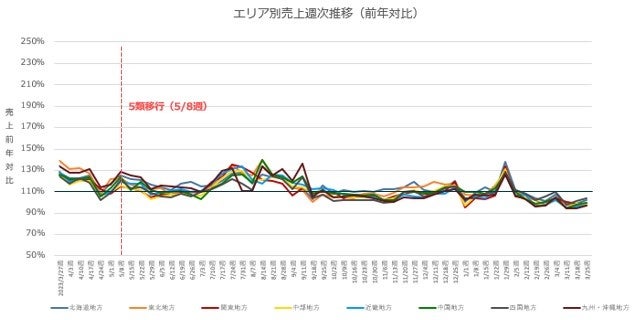各地域の売上については、北海道地方・関東地方・四国地方以外の地域で前年対比100%を割る。