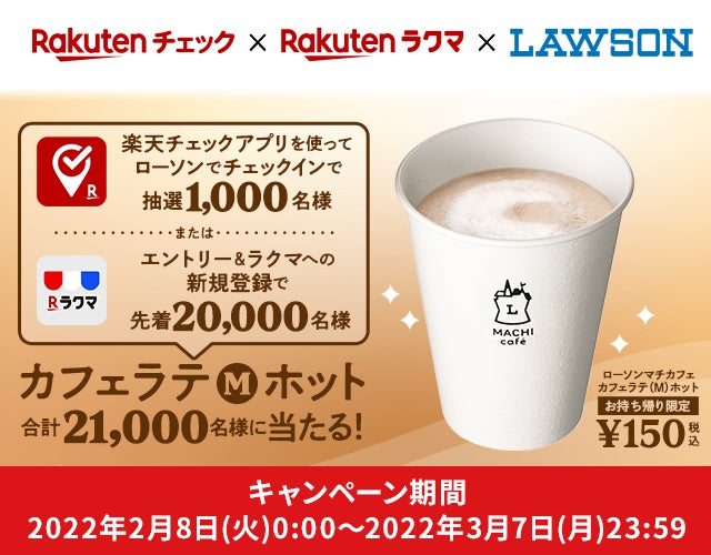 楽天ペイメント株式会社(本社:東京都港区、代表取締役社長:中村 晃一、以下「楽天ペイメント」)と楽天グループ株式会社(本社:東京都世田谷区、代表取締役会長兼社長:三木谷 浩史、以下「楽天」)は、ポイ活サービス「楽天チェック」とフリマアプリ「ラクマ」において、株式会社ローソン(本社:東京都品川区、代表取締役社長:竹増 貞信、以下「ローソン」)と共同で、通常価格150円(税込)のローソンのマチカフェ カフェラテ(M)ホット無料引換券がもらえる「マチカフェ カフェラテ(M)ホットプレゼントキャンペーン」を2月8日(火)から3月7日(月)まで実施します。